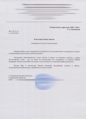 Выражаю Вас слова искренней благодарности за сотрудничество и оказанную помощь в обеспечении деятельности нашей компании.